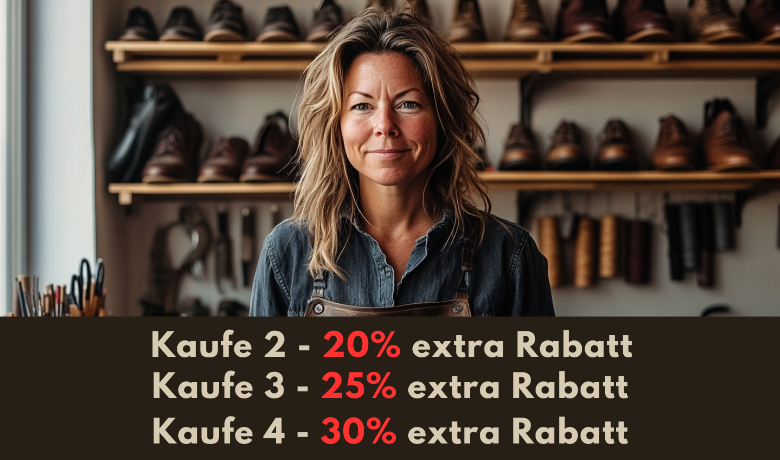 Schweren Herzens schließe ich meine Schuhmacher-Stube. Um die letzten Bestände zu räumen, biete ich einen großen Ausverkauf mit Rabatten von bis zu 80 % an. Verpassen Sie es nicht - wenn sie weg sind, sind sie weg!